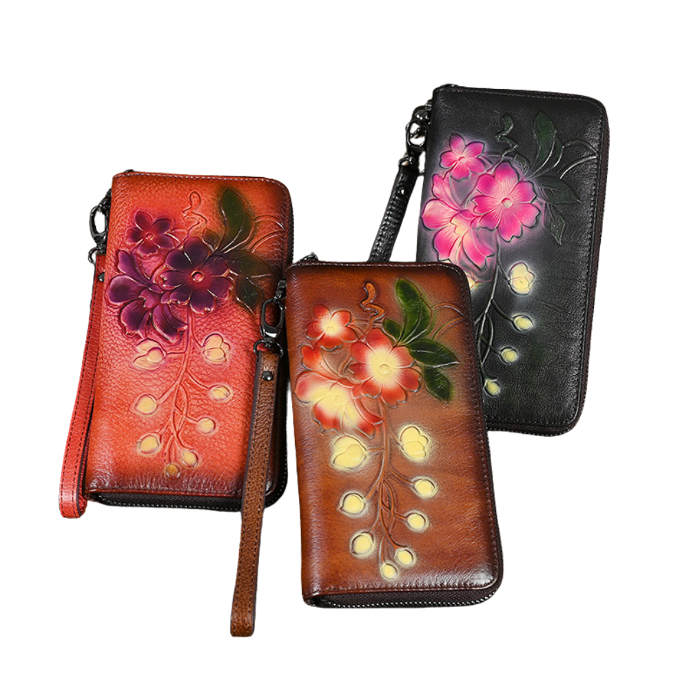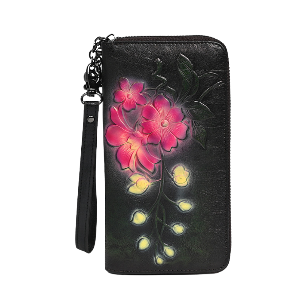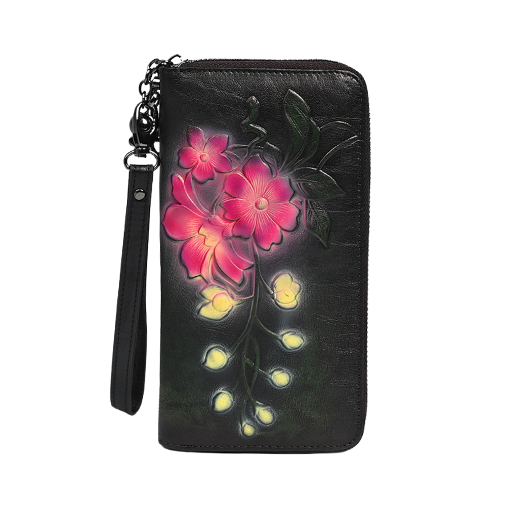 Ce portefeuille en cuir véritable se distingue par son motif floral délicat, peint à la main avec soin. Son design original associe finesse artistique et conception durable, pour un style élégant en toute circonstance.